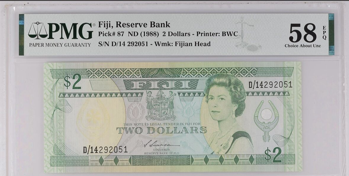 Fiji banknote (1988) 2 dollars graded 58 pmg